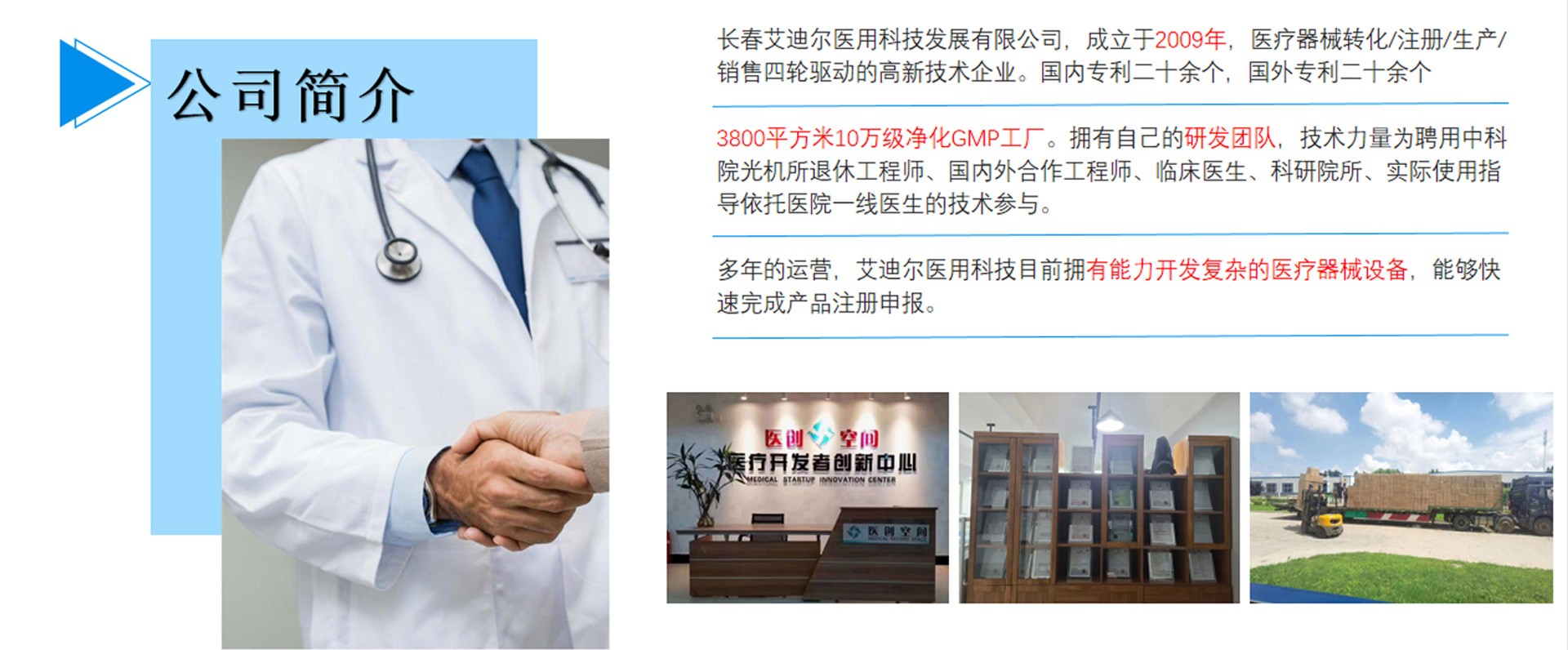 長春艾迪爾醫用科技發(fā)展有限公司為集產(自有工廠); 學(多所院校科研課題合作單位);研(研發(fā)成果轉化注冊)三位一體的高新技術企業。艾迪爾科技主要經營范圍為一次性醫療器械耗材的開發(fā),專注于抗菌肽新材料的開發(fā)和研制,以“IN-58抗菌肽一類新藥及原料藥注冊、激光類治療儀”兩個核心優(yōu)勢技術為中心。公司擁有標準GMP車間及健全的質量管理體系,擁有多個已上市和即將上市的產品,包括睡眠、泌尿、口腔、肝膽、消殺、婦科六大系列產品線。公司擁有核心專業技術報批團隊,承接國內外醫療器械專項成果轉化,具備自主研發(fā)能力及MAH服務能力。